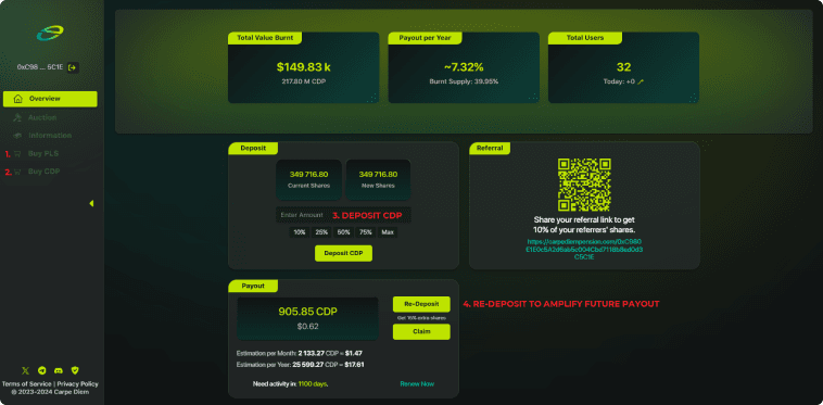 Carpe Diem Pension, on Pulse blockchain, redefines retirement with a self-managed, inclusive, globally portable fund. Unique for its token burn mechanism, it ensures a sustainable 4.32% inflation payout. With $143.11k and 41.06% of CDP already burned, it serves 35 users globally.
